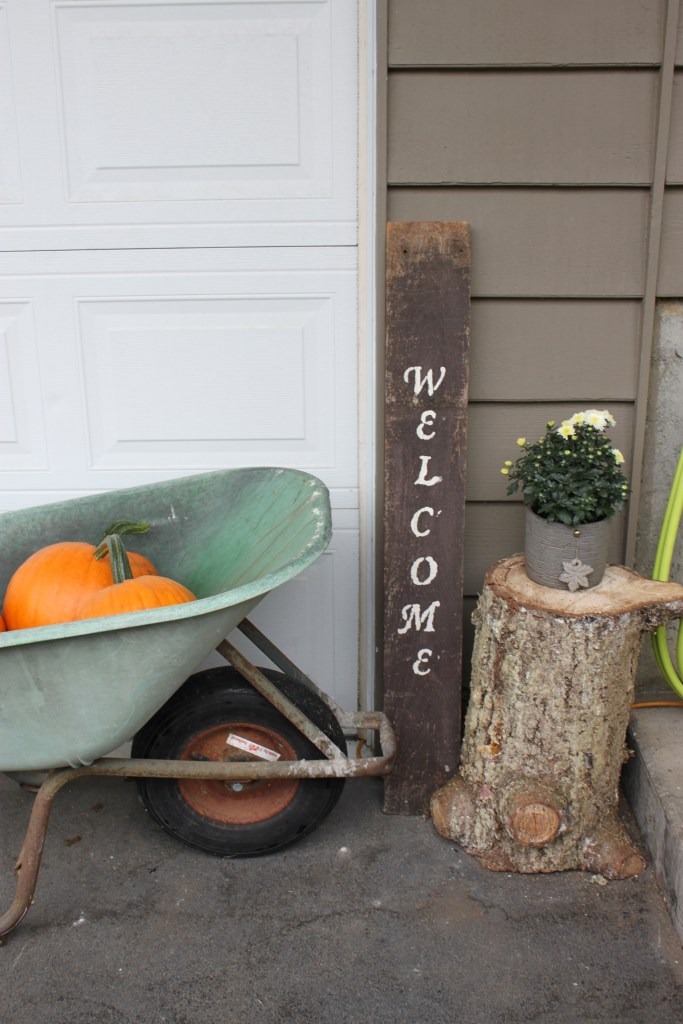 One of my neighbors cut down a huge tree so I grabbed a few BIG stumps. Plus an added bonus I grew pumpkins this year and have just enough for decor out front and lots to make pies and soup with!