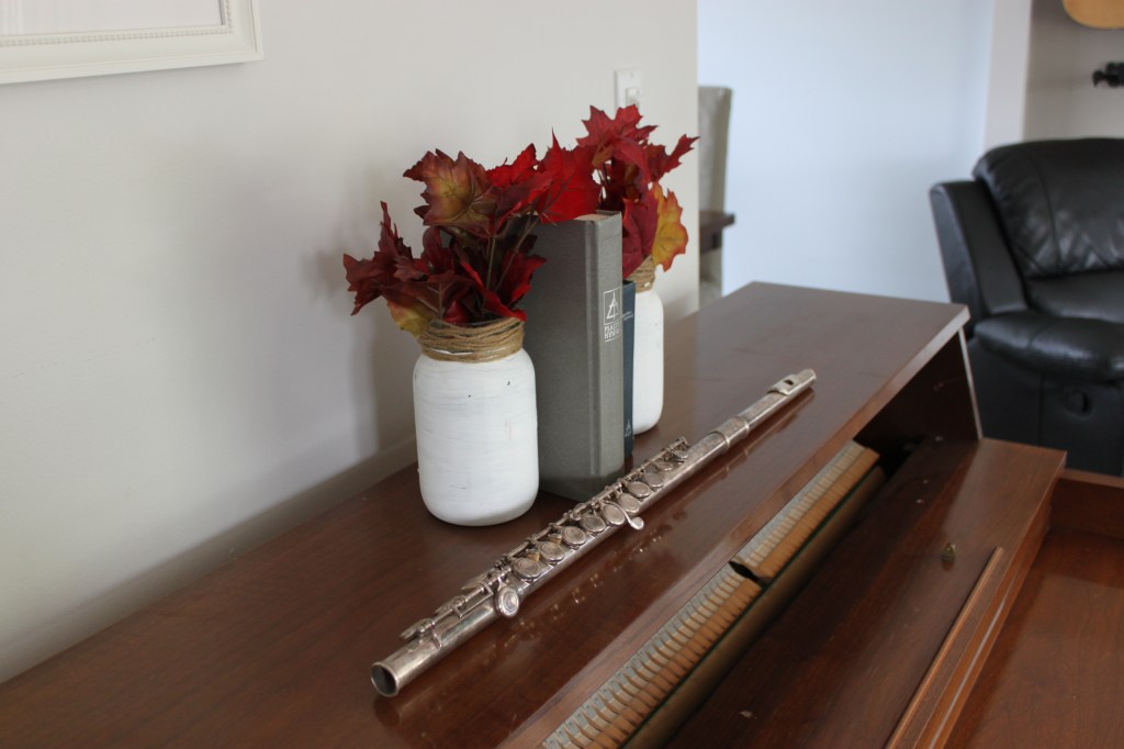 Also in my living room is my piano. I’m pretty sure it’s not trendy to have mason jars as decor anymore. In my house they still are. I just switch out the bunches of white flowers I usually have for these nice fall looking leaves.