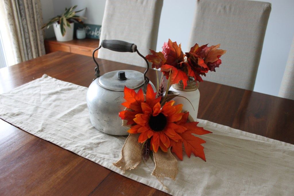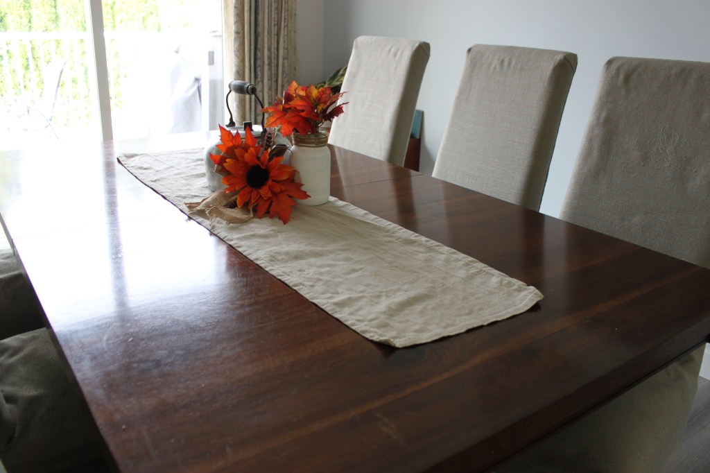 Here’s our kitchen table. This is a table runner I repurposed from curtains I bought that were too long. Again, I kept it simple. This set up I can easily move aside for meals and after cleaning the table just slide it back.